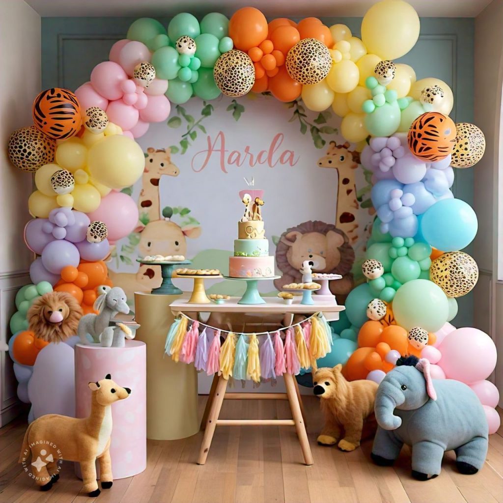 2. Cute forest theme-Wild One safari or jungle theme with cute animal decorations like lions, elephants, and giraffes. Children love to see animals.Use green and earthy tones to create a wild, adventurous feel.