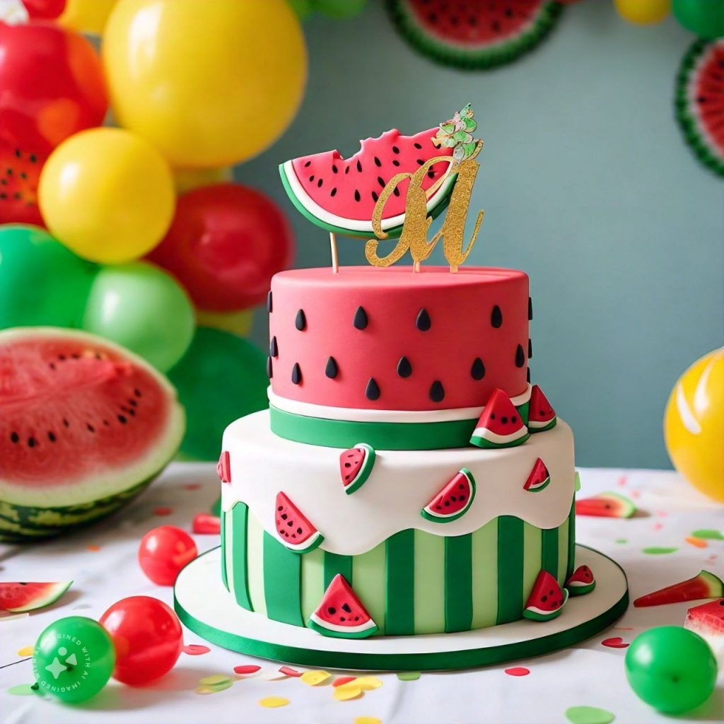 3.Water melon theme– watermelon-themed party with vibrant pinks and greens.Look very colourful and vibrant,Include watermelon-shaped balloons, decorations, and a watermelon-themed cake.